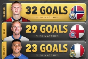 體育資訊11月17日訊 Score90統(tǒng)計了本賽季五大聯(lián)賽球員俱樂部+國家隊的進(jìn)球數(shù)量,并列出榜單,哈蘭德32球居首,凱恩、姆巴佩二三位。