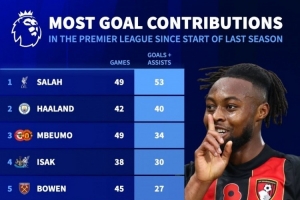 體育資訊11月18日訊 德國轉(zhuǎn)會市場統(tǒng)計(jì)了上賽季至今球員在英超參與進(jìn)球的數(shù)量,并列出榜單,薩拉赫53球居首,哈蘭德40球次席,姆伯莫34球第三。