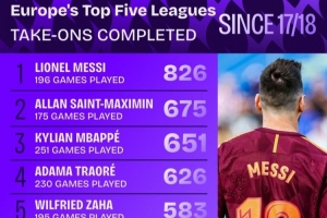 體育資訊11月19日訊 Squawka統(tǒng)計自17-18賽季以來,五大聯(lián)賽球員成功過人次數(shù),梅西以826次居首,圣馬克西曼、姆巴佩排在二三位。