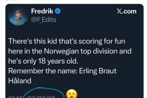 2018年9月23日,記者Fredrik在社交媒體上寫(xiě)道:“挪威頂級(jí)聯(lián)賽有一個(gè)少年,進(jìn)球如同探囊取物,而他只有18歲。請(qǐng)記住這個(gè)名字——埃爾林·布賴(lài)于特-哈蘭德?!?/p>