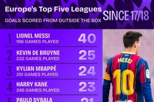 17-18賽季以來五大聯(lián)賽禁區(qū)外進球:梅西40球最多,丁丁25球次席