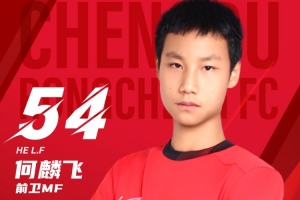 何麟飛,2009年1月19日出生于四川成都 ,身高172cm,體重60kg,司職進(jìn)攻型中場。此前,何麟飛代表成都蓉城足球俱樂部U16梯隊出場60場,貢獻(xiàn)13粒進(jìn)球、18次助攻,在傳射方面都展現(xiàn)出一定的特點。何麟飛出自成都本土青訓(xùn),具有較好的領(lǐng)導(dǎo)能力,在多場比賽中擔(dān)任球隊隊長,并多次獲得單場最佳球員。何麟飛曾帶領(lǐng)球隊獲得2022年省錦標(biāo)賽冠軍、2023年省運會冠軍、2024年中國足協(xié)青少年足球錦標(biāo)賽季軍、2024年第四屆貢嘎杯冠軍以及2024年省錦標(biāo)賽冠軍。2024年,何麟飛曾入選U15男足國家隊第四期集訓(xùn),并隨球隊赴韓國進(jìn)行拉練。何麟飛的到來,將為成都蓉城B隊中前場提供有力的支持,注入更強(qiáng)大的戰(zhàn)斗力。