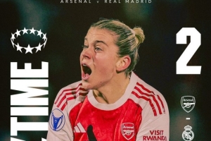此役上半場(chǎng)卡羅琳·威爾為皇馬女足先拔頭籌,下半場(chǎng)阿萊西婭·魯索連進(jìn)兩球,最終阿森納女足2-1逆轉(zhuǎn)皇馬女足。