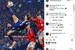 麥克托米奈社媒慶祝球隊(duì)進(jìn)入世界杯,配文:“美國(guó)寶貝,蘇格蘭來(lái)了!”
