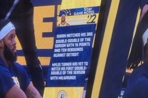 比賽首節(jié)主場展示以賽亞-杰克遜數(shù)據(jù)寫道:“以賽亞·杰克遜在對陣活塞時砍下16分10籃板,拿到賽季第三次兩雙,邁爾斯·特納在雄鹿還沒拿過兩雙?!?/p>