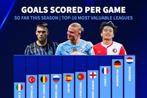體育資訊11月20日訊 德國轉(zhuǎn)會市場統(tǒng)計了歐洲總身價前10聯(lián)賽的場均進球數(shù)量,并列出榜單,荷甲3.36球居首,德甲、法甲二三位、意甲2.22球墊底。