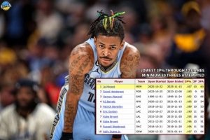 賽季至今,莫蘭特出戰(zhàn)12場,三分球60投10中,命中率只有16.7%,在NBA歷史上所有賽季前12場三分出手數(shù)至少50次的球員中,這一命中率是最低的。