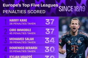 18-19賽季以來五大聯(lián)賽點球進(jìn)球排名:
