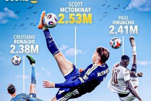 麥克托米奈倒鉤時的腳尖高度為2.53米,此前奧努阿楚的紀錄為2.41米,而C羅的紀錄為2.38米。