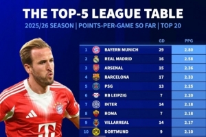 體育資訊11月21日訊 五大聯(lián)賽戰(zhàn)火即將重燃,《轉(zhuǎn)會(huì)市場(chǎng)》也統(tǒng)計(jì)了本賽季五大聯(lián)賽球隊(duì)場(chǎng)均拿分情況,拜仁獨(dú)自領(lǐng)跑。