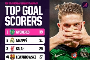 ■歐洲十大聯(lián)賽 | 2024-2025賽季最佳射手榜: