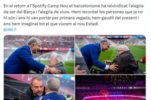 巴薩俱樂部主席拉波爾塔在社交媒體上寫道:“在重返坎普諾的這一天,巴薩球迷們重新找回了身為巴薩人的喜悅與快樂?!?/p>