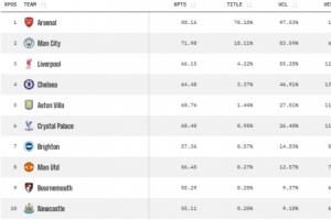 數(shù)據(jù)機(jī)構(gòu)Opta的大數(shù)據(jù)預(yù)測再度進(jìn)行更新,目前英超各隊(duì)的奪冠概率:阿森納奪冠概率升至70.18%,曼城18.11%;利物浦4.22%,切爾西3.47%。該榜單的第5名為1.44%的維拉,其余球隊(duì)奪冠概率均不足1%。
