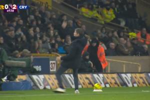 水晶宮在下半場6分鐘2球完勝狼隊,主帥格拉斯納在場邊激情慶祝第二球時差點滑倒,隨后他順勢轉圈握拳鼓勁。