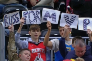 在本場比賽中,有一位身穿火箭0號的球迷舉著威少MVP的牌子。