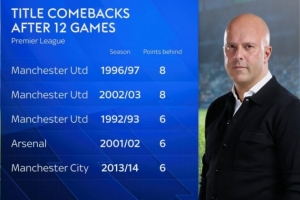 據天空體育統(tǒng)計,第12輪落后榜首6分或更多最終奪冠,英超歷史只出現過5次這樣的情況。