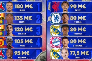 外媒列法國球員歷史轉(zhuǎn)會費榜:歐元