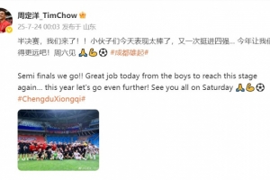 周定洋在個(gè)人微博中寫道:半決賽,我們來了!!小伙子們今天表現(xiàn)太棒了,又一次挺進(jìn)四強(qiáng)… 今年讓我們走得更遠(yuǎn)吧!周六見 ??????