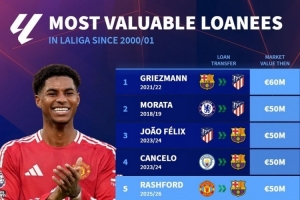 體育資訊7月24日訊 德國轉(zhuǎn)會市場統(tǒng)計(jì)了本世紀(jì)以來租借加盟西甲俱樂部球員的身價,并列出榜單,格列茲曼6000萬歐居首,拉什福德5000萬歐排名并列第2位。