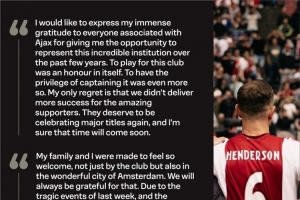 體育資訊7月10日訊 亨德森與阿賈克斯就終止合同達(dá)成一致,自由身離隊,阿賈克斯官方更新社媒動態(tài),曬出亨德森的告別信。