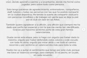 “結(jié)束這段旅程讓我心痛,但我自豪地告別,因為我已經(jīng)全力以赴,捍衛(wèi)了這些顏色和隊徽?;仡欉^去,我為走過的每一步感到自豪,并且我將永遠(yuǎn)是一名瓦倫西亞人。”
