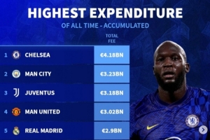 體育資訊7月25日訊 《轉會市場》統(tǒng)計了各隊歷史轉會費總支出情況,切爾西獨自領跑。