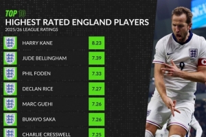 體育資訊12月5日訊 WhoScored統(tǒng)計(jì)了本賽季英格蘭球員的聯(lián)賽場均評分,并列出榜單,凱恩居首,貝林厄姆、福登分列二三位。