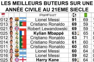 在21世紀(jì)自然年進(jìn)球榜上,姆巴佩63球的成績(jī)已經(jīng)超越2012年的C羅來(lái)到第4。在2025年皇馬僅剩2場(chǎng)比賽,想達(dá)到2013年C羅、2021年萊萬(wàn)的69球已經(jīng)幾乎不可能。在這份榜單的榜首,2012年梅西的91球仍遙不可及。