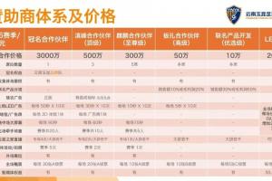 其中,2026賽季云南玉昆設(shè)立了1個(gè)冠名合作伙伴席位,參考價(jià)值3000萬(wàn)元,而其他各檔贊助席位則從10萬(wàn)-500萬(wàn)元不等。