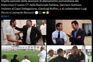 意大利新帥加圖索及領(lǐng)隊(duì)布馮、助教博努奇和里奇奧在今日下午造訪了尤文訓(xùn)練基地,和俱樂(lè)部上下進(jìn)行了友好交流。
