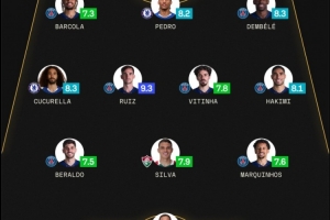中場:庫庫雷利亞(切爾西,8.3分)、法比安-魯伊斯(巴黎,9.3分)、維蒂尼亞(巴黎,7.8分)、阿什拉夫(巴黎,8.1分)