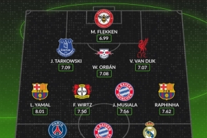 體育資訊7月29日訊 whoscored統(tǒng)計了24-25賽季的五大聯(lián)賽賽季評分最佳陣容,巴薩、拜仁各2將入圍。