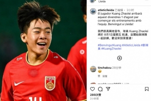 今日該俱樂部在社媒曬出鄺兆鐳身穿國少球衣的照片,并用西語和中文宣布球員將于8月1日抵達球隊,并將和一線隊訓練比賽。萊里達競技公告寫道: