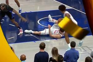 剛開場64秒,火箭中鋒申京搶籃板落地踩腳受傷,表情痛苦,已回更衣室。