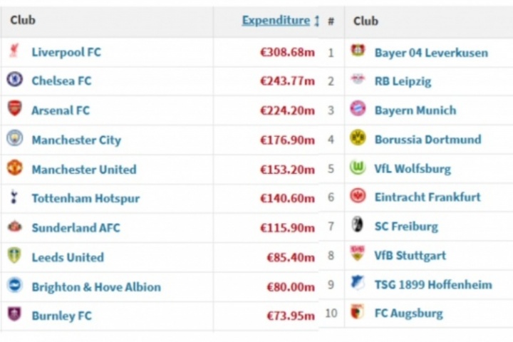 目前,英超已有七隊花費超過1億歐,其中包括升班馬桑德蘭;而德甲截至目前僅勒沃庫森支出超過1億歐。