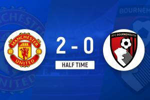 上半場補時1分鐘,曼聯(lián)2-0伯恩茅斯。