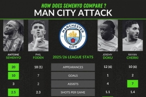 體育資訊1月8日訊 根據(jù)多家媒體的報道,伯恩茅斯邊鋒塞梅尼奧將加盟曼城,WhoScored統(tǒng)計了塞梅尼奧與幾位曼城攻擊手本賽季的英超數(shù)據(jù)。