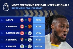體育資訊1月9日訊 伯恩茅斯前鋒塞梅尼奧以7200萬歐元的價格加盟曼城,根據(jù)德轉統(tǒng)計,他成為英超歷史上轉會費第四高的非洲球員,僅次于尼古拉斯·佩佩、姆伯莫和馬爾穆什。