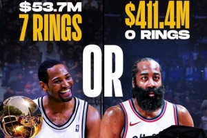 詹姆斯-哈登的(薪資)收入已經超過了4.11億美元,但NBA生涯至今冠軍數仍是0。