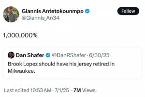 值得一提的是,在7月初,字母哥在回答球迷問答的時候曾表示,雄鹿會1000000%退役大洛的球衣。