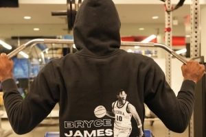 詹姆斯曬出了一組個人訓練照,在其中多張照片中,他身穿印有小兒子布萊斯形象的定制連帽衫。