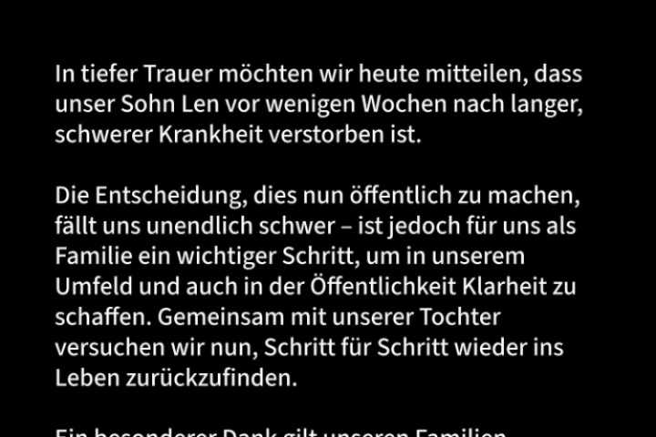 今天,我們懷著沉痛的心情宣布,我們的兒子倫因長(zhǎng)期患重病于幾周前去世。