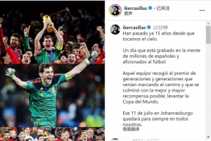 體育資訊7月11日訊 西班牙傳奇門將卡西更新社媒動(dòng)態(tài),回顧15年前的今天贏得世界杯冠軍