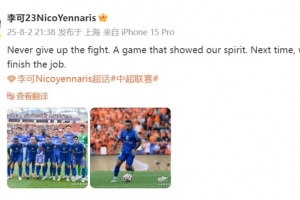 體育資訊8月2日訊 中超聯(lián)賽第19輪,上海申花客場(chǎng)在0-3落后的情況下,4-4戰(zhàn)平云南玉昆。賽后,申花球員李可更新了個(gè)人社交媒體。