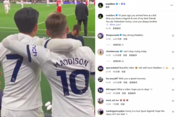 麥迪遜在社媒中曬出了自己與孫興慜合集片段,并配文:“10年前你來(lái)到這里是還是一個(gè)孩子?,F(xiàn)在你作為傳奇&我的朋友的身份離開。你就是托特納姆孫尼。永遠(yuǎn)愛(ài)你兄弟?!?/p>