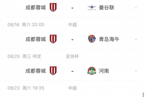根據(jù)賽程,蓉城8月還有6場比賽,分別是8月8日聯(lián)賽客戰(zhàn)大連英博、8月12日亞冠精英聯(lián)賽附加賽主場對陣曼谷聯(lián)、8月16日聯(lián)賽主場對陣青島海牛、足協(xié)杯主場對陣河南隊(時間待定)、8月23日聯(lián)賽客場對陣云南玉昆以及8月30日聯(lián)賽主場對陣海港。