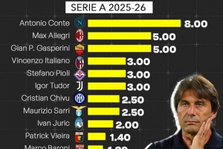 體育資訊08月06日訊 近日,意大利金融媒體Calcio e Finanza統(tǒng)計(jì)了25-26賽季意甲各隊(duì)主帥的年薪排行。