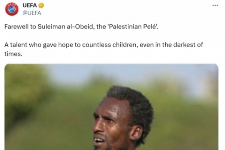 歐足聯(lián)官方寫道:“讓我們告別蘇萊曼-奧貝德,他被稱作‘巴勒斯坦貝利’。即使是在最黑暗的時刻,他也給無數(shù)的孩子們帶來了希望?!?/p>