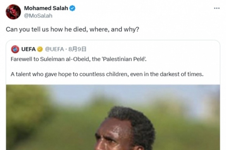 體育資訊08月10日訊 歐足聯(lián)官方此前發(fā)文,向不幸喪生的巴勒斯坦球星奧貝德簡短致哀。利物浦球星薩拉赫轉(zhuǎn)發(fā)了這則帖文,并發(fā)出了三個(gè)疑問。