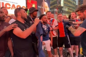 巴黎球迷聚集在紐約時代廣場,他們載歌載舞,為球隊(duì)助威,預(yù)熱決賽,巴黎官方社媒曬出視頻。